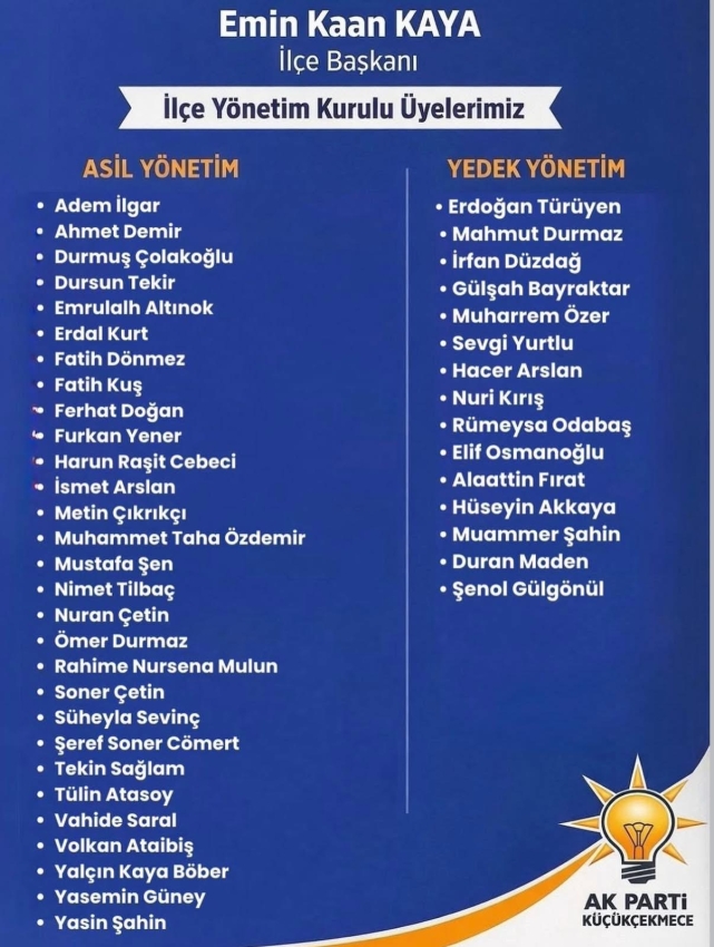 AK Parti Küçükçekmece İlçe Başkanlığı, yeni İlçe Yönetim Kurulu listesini kamuoyuna duyurdu. Açıklamayı yapan Emin Kaan Kaya, yeni döneme ilişkin heyecan ve kararlılık mesajları verdi.
