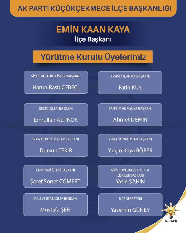 AK Parti Küçükçekmece İlçe Başkanlığı, teşkilat çalışmalarını daha etkin ve güçlü bir şekilde sürdürebilmek amacıyla yeni dönem İlçe Yürütme Kurulu listesini belirledi. İlçe Başkanı Av. Emin Kaan Kaya’nın başkanlığında oluşturulan yürütme kurulunun, teşkilatın sahadaki faaliyetlerini daha koordineli ve verimli bir şekilde yürütmesi hedefleniyor.