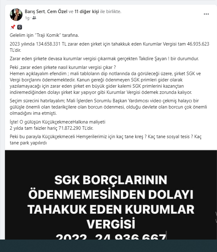 Gelelim işin “Traji Komik” tarafına.2023 yılında 134.658.331 TL zarar eden şirket için tahakkuk eden Kurumlar Vergisi tam 46.935.623 TL’dir.Zarar eden şirkete devasa kurumlar vergisi çıkarmak gerçekten Takdire Şayan ! bir durumdur.Peki ,zarar eden şirkete nasıl kurumlar vergisi çıkar ?Hemen açıklayalım efendim ; mali tabloların dip notlarında da görüleceği üzere, şirket SGK ve Vergi borçlarını ödememektedir. Kanun gereği ödenmeyen SGK primleri gider olarak yazılamayacağı için zarar eden şirket en büyük gider kalemi SGK primlerini kazançtan indiremediğinden dolayı şirket kar yapıyor gibi Kurumlar Vergisi ödemek zorunda kalıyor.Seçim sürecini hatırlayalım; Mali İşlerden Sorumlu Başkan Yardımcısı video çekmiş halaycı bir gülüşle önemli olan tedarikçilere olan borcun ödenmesi, olduğu devlete olan borcun çok önemli olmadığını ima etmişti.İşte! O gülüşün KüçükçekmeceHalkına maliyeti2 yılda tam faizler hariç 71.872.290 TL’dir.Peki bu parayla Küçükçekmeceli Hemşerilerimiz için kaç tane kreş ? Kaç tane sosyal tesis ? Kaç tane park yapılırdı.Bir diğer ilginç husus ise,şirketin gelir tablosundaki -54.112.250 TL Brüt Satış ZararıŞirket,belediyeye taşeron çalışanlarla ilgili maliyetin üzerine %3-%5 gibi kar koyup fatura etmektedir. (Ak parti döneminde %3 tü şimdi kesin olmamakla birlikte %5 olduğu bilgisini aldım.)Satışların %90 gibi kısmını bu gelirler oluştururken şirketin en azından Brüt Satış Geliri yazması beklenir. Bu durum, Sosyal Tesis ve otopark işletmelerininde ciddi zarar yazdığı izlenimi vermektedir.Sosyal Tesisler kar amacı gütmeyen yerler olup denk bütçeyle yönetilmelidir.Maliyetin çok altında satış yaparak şirketin zarar ettirilmesi bir yönetim zafiyetidir.Sosyal tesisler için yapılan alımların,piyasa koşullarında rekabetçi ortamda yapılıp yapılmadığı hususunun Meclis üyelerimiz tarafından yakınen takip edilecektir.Şirketin 2023 yıl sonu bilançosuna göre alıcılar hesabında 561.329.570 TL gibi yüksek oranda bir alacağı bulunmaktadır.Cari hesap olarak sadece Küçükçekmece Belediyesiyle çalıştığını düşünürsek , belediye bu borcu şirkete ödemeyerek KİTAŞ’ın milyonlarca TL zarar etmesine , milyonlarca TL gecikme faizi ödemesine sebeb oluyor ?Küçükçekmece Belediye Yönetimi ,nakit akışını doğru yönetemeyerek Küçükçekmece Halkından topladığı vergilerin heba olmasına sebeb olmaktadır.Şirketin 2023 yıl sonu bilançosunda,borçlar kısmı incelendiğinde ;Satıcılara : 31.152.221 TLPersonele Borçlar : 60.917.428 TLSGK ve Vergi Borcu : 640.456.034 TL olduğu gözükmektedir.SGK ve vergi borçlarında gözüken 640.456.428 TL borcun içinde gecikme zamlarının yazılıp yazılmadığı, yazılmadıysa net zararın ve öz sermayenin çok daha yüksek noktalara ulaşacağı açıklanması gereken önemli bir unsurdur. (Şahsi kanaatim 2023 yılı geçikme zamlarının bilançoya yansıtılmadığıdır.)Son olarak KİTAŞ’ın mevcut yönetim kuruluna veya değişecekse müstakbel yönetim kuruluna naçizane tavsiyem ;Kesinlikle Küçükçekmece Belediyesi Mali İşlerden Sorumlu Başkan Yardımcısı kim olacaksa , bu kişinin KİTAŞ’ta İMZA YETKİLİ yönetim kurulu üyesi olma zorunluluğunu talep edin. Emin olun ki ; ya bu sorumluluğu almak istemeyecek , almak zorunda kalırsada En önemli hassasiyeti Kitaş’ın vergi ve SGK borçlarını ödemek olacaktır.Böylece davul sizin boynunuzda tokmak başkasının elinde olmayacaktır. Bu da size yapıcı muhalefet anlayışımızın nişanesi olsun .