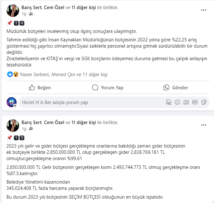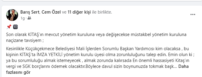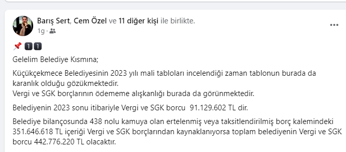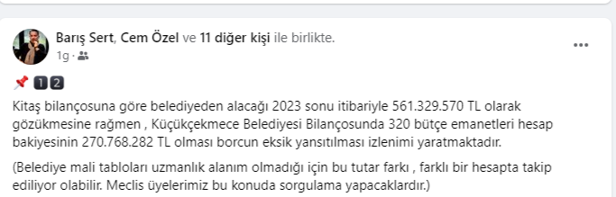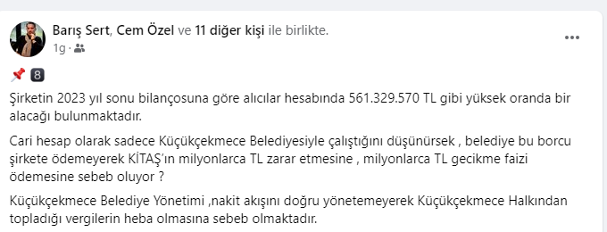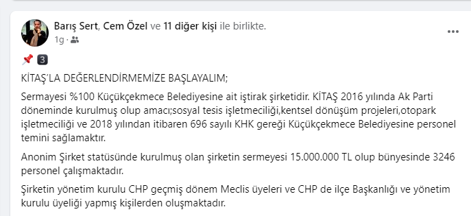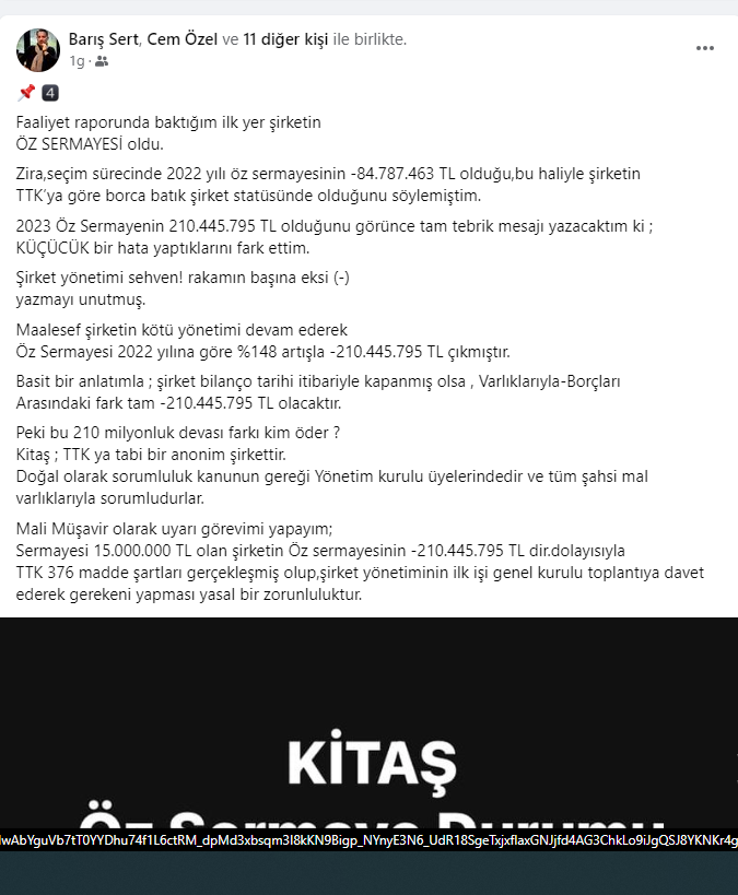 haber yapan sosyal medya hesaplarında görmenizin mümkün olmadığı rakamları sizinlerle paylaşacağım.16.04.2024 salı günü yapılacak 2.Meclis oturumumuzda , Meclis Üyelerimiz faaliyet raporu üzerinde kapsamlı bir değerlendirme yapacaklardır.Küçükçekmece Belediye Başkanı Sn.Kemal Çebi’nin Meclisin 8.dönem açılış konuşmasını çok kıymetli buluyorum.“Şeffaf,hesap verebilir belediyecilik anlayışında olacağız , halktan toplanan 1 TL verginin bile nereye harcandığını halkımıza anlatacağız.”Sözlerinin, Sn.Başkanın taahhüdü olduğunu kabul ediyor ; belediye Meclis üyelerimizin Küçükçekmece halkı adına vereceği soru önergelerini, hızlı ve “amasız-lakinsiz” bir şekilde cevaplanmasını bekliyor olacağız..KİTAŞ’LA DEĞERLENDİRMEMİZE BAŞLAYALIM;Sermayesi %100 Küçükçekmece Belediyesine ait iştirak şirketidir. KİTAŞ 2016 yılında Ak Parti döneminde kurulmuş olup amacı;sosyal tesis işletmeciliği,kentsel dönüşüm projeleri,otopark işletmeciliği ve 2018 yılından itibaren 696 sayılı KHK gereği Küçükçekmece Belediyesine personel temini sağlamaktır.Anonim Şirket statüsünde kurulmuş olan şirketin sermeyesi 15.000.000 TL olup bünyesinde 3246 personel çalışmaktadır.Şirketin yönetim kurulu CHP geçmiş dönem Meclis üyeleri ve CHP de ilçe Başkanlığı ve yönetim kurulu üyeliği yapmış kişilerden oluşmaktadır.Faaliyet raporunda baktığım ilk yer şirketinÖZ SERMAYESİ oldu.Zira,seçim sürecinde 2022 yılı öz sermayesinin -84.787.463 TL olduğu,bu haliyle şirketinTTK’ya göre borca batık şirket statüsünde olduğunu söylemiştim.2023 Öz Sermayenin 210.445.795 TL olduğunu görünce tam tebrik mesajı yazacaktım ki ; KÜÇÜCÜK bir hata yaptıklarını fark ettim.Şirket yönetimi sehven! rakamın başına eksi (-)yazmayı unutmuş.Maalesef şirketin kötü yönetimi devam ederekÖz Sermayesi 2022 yılına göre %148 artışla -210.445.795 TL çıkmıştır.Basit bir anlatımla ; şirket bilanço tarihi itibariyle kapanmış olsa , Varlıklarıyla-BorçlarıArasındaki fark tam -210.445.795 TL olacaktır.Peki bu 210 milyonluk devası farkı kim öder ?Kitaş ; TTK ya tabi bir anonim şirkettir.Doğal olarak sorumluluk kanunun gereği Yönetim kurulu üyelerindedir ve tüm şahsi mal varlıklarıyla sorumludurlar.Mali Müşavir olarak uyarı görevimi yapayım;Sermayesi 15.000.000 TL olan şirketin Öz sermayesinin -210.445.795 TL dir.dolayısıylaTTK 376 madde şartları gerçekleşmiş olup,şirket yönetiminin ilk işi genel kurulu toplantıya davet ederek gerekeni yapması yasal bir zorunluluktur.