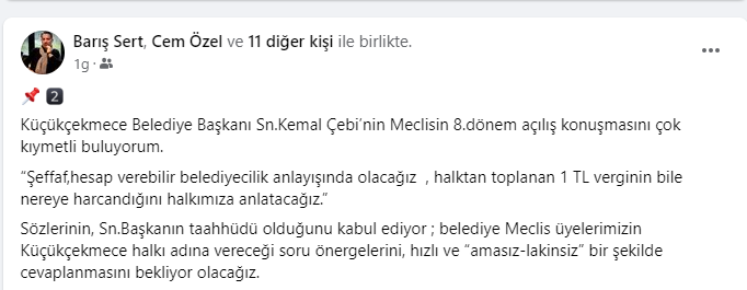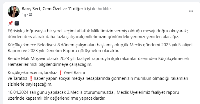 Eğrisiyle,doğrusuyla bir yerel seçimi atlattık.Milletimizin vermiş olduğu mesajı doğru okuyarak; dünden ders alarak daha fazla çalışacak,milletimizin gönlündeki yerimizi yeniden alacağız.Küçükçekmece Belediyesi 8.dönem çalışmaları başlamış olup,ilk Meclis gündemi 2023 yılı Faaliyet Raporu ve 2023 yılı Denetim Raporu görüşmeleri olacaktır.Bende Mali Müşavir olarak 2023 yılı faaliyet raporuyla ilgili rakamlar üzerinden Küçükçekmeceli Hemşerilerimizi bilgilendirmeye çalışacağım.Küçükçekmecenin,Tarafsız