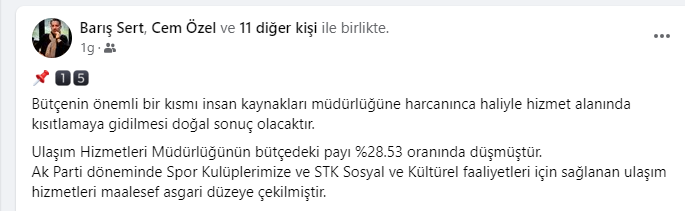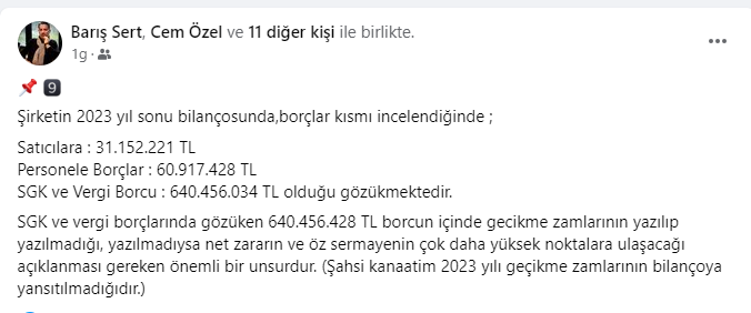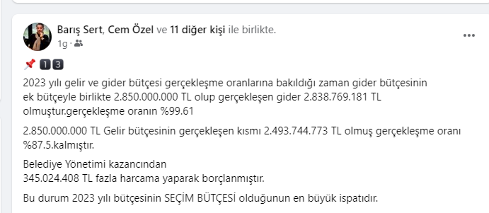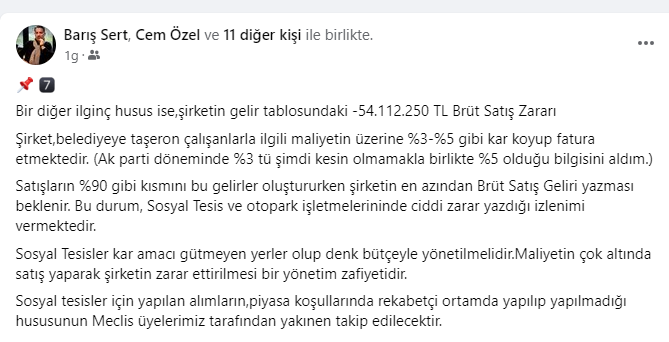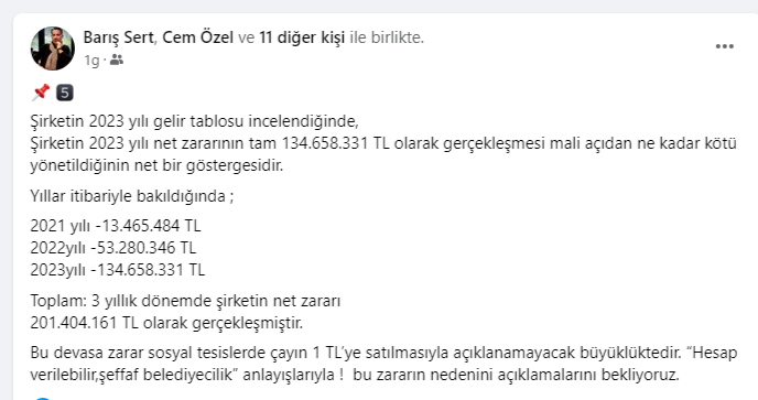 Şirketin 2023 yılı gelir tablosu incelendiğinde,Şirketin 2023 yılı net zararının tam 134.658.331 TL olarak gerçekleşmesi mali açıdan ne kadar kötü yönetildiğinin net bir göstergesidir.Yıllar itibariyle bakıldığında ;2021 yılı -13.465.484 TL2022yılı -53.280.346 TL2023yılı -134.658.331 TLToplam: 3 yıllık dönemde şirketin net zararı201.404.161 TL olarak gerçekleşmiştir.Bu devasa zarar sosyal tesislerde çayın 1 TL’ye satılmasıyla açıklanamayacak büyüklüktedir. “Hesap verilebilir,şeffaf belediyecilik” anlayışlarıyla ! bu zararın nedenini açıklamalarını bekliyoruz.