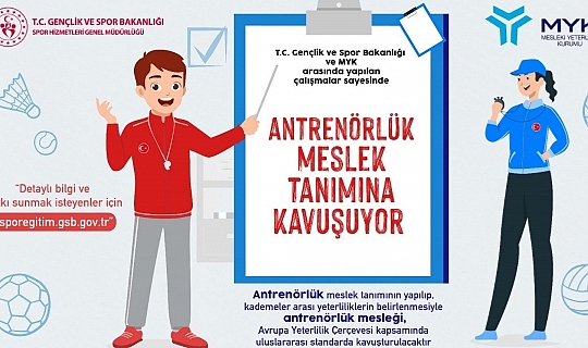 Bu kapsamda, antrenörlük meslek tanımı yapılması için MYK ile Bakanlığımız arasında 4 Aralık 2024 tarihinde Genel Müdürümüz Prof. Dr. Veli Ozan ÇAKIR ve MYK Kurum Başkanı Prof. Dr. Mustafa Necmi İLHAN’ın katılımıyla İşbirliği Protokolü imzalanmıştır.