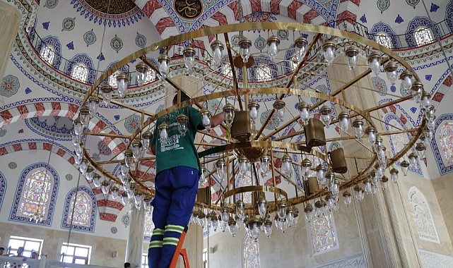 Ramazan ayı boyunca cemaatin rahat ve huzurlu bir şekilde ibadet edebilmesi için yapılan çalışmalar kapsamında cami halıları özel temizlik malzemeleriyle dezenfekte edilirken, avizeler, pencereler, mihrap, minber ve kürsüler titizlikle temizleniyor. Abdesthaneler ve lavabolar da hijyen standartlarına uygun şekilde dezenfekte edilerek kullanım konforu artırılıyor.