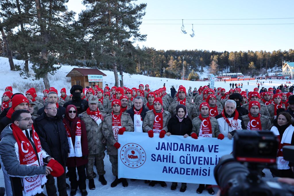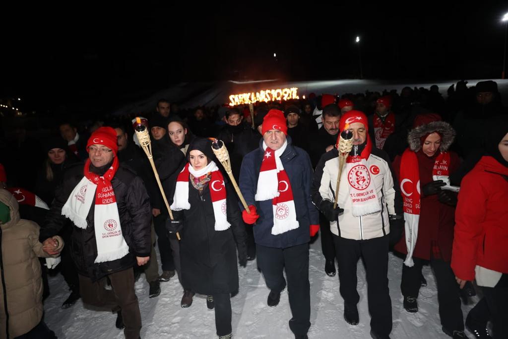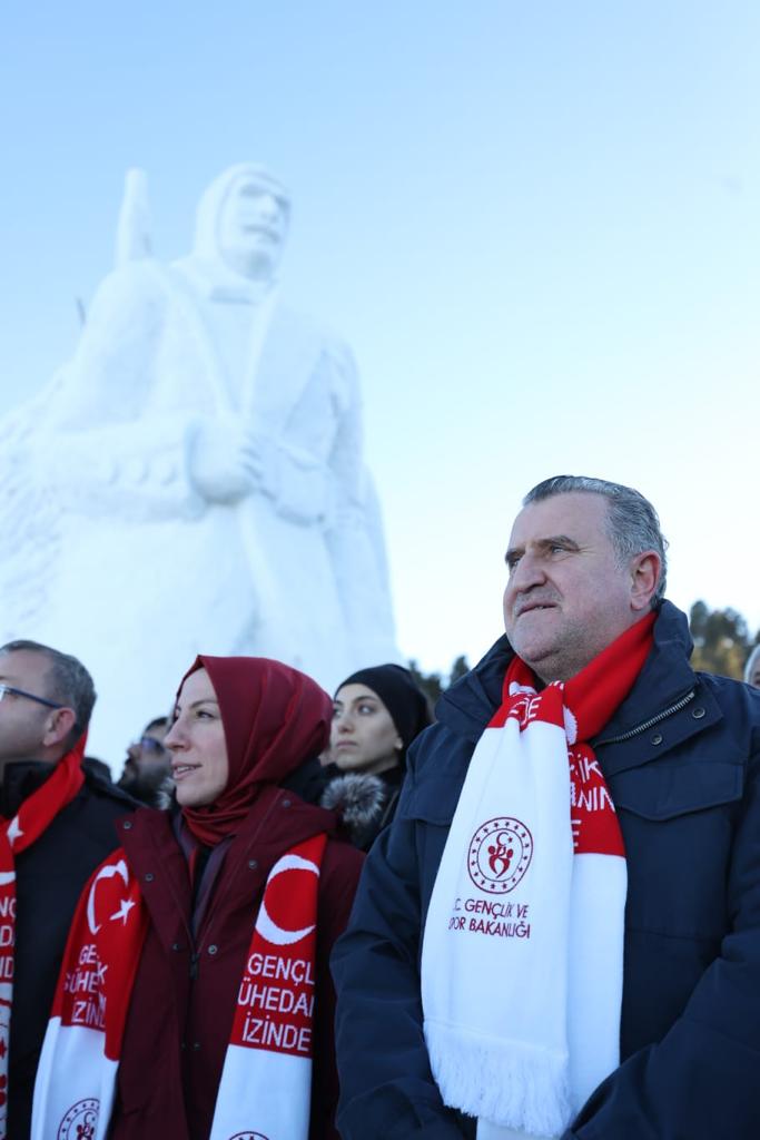 Gençlik ve Spor Bakanı Osman Aşkın Bak, sarıkamış Şehitleri'ni anma etkinlikler kapsamında Kars’a geldi. Bakan Bak ilk olarak Ankara'dan Sarıkamış'a tarihi Doğu Ekspresi'yle gelen gençleri karşıladı.Sarıkamış Tren Garı'na yaklaşık 27 saatlik yolculuğun ardından gelen treni karşılayan Bakan Bak, burada basın mensuplarına da açıklamalarda bulundu.Önemli bir etkinliği bu yılda gerçekleştirdiklerini aktaran Bakan Bak, "Gençlerimiz, Anadolu'muzun güzelliklerini görerek geldiler. Sarıkamış bizim tarihimizde önemli bir yere sahip. Allahuekber Dağları’nda kaybettiğimiz, bu vatanı korumak için canını veda eden şehitlerimizi anıyoruz. Gençlik ve Spor Bakanlığı olarak Sarıkamış’a her yıl Türkiye’nin dört bir yanından gençlerimizi getiriyoruz. Geçen yıl da tren organizasyonu olmuştu. Gençlerimiz ve halkımızdan çok talep gördü. İnşallah bu süreci devam edeceğiz." ifadelerini kullandı.Şehitleri anmanın önemine dikkati çeken Bakan Bak, "Şehitlerimizin kanlarıyla yoğurulmuş bu topraklar bizim için çok önemli. Gençlerimize bu coğrafyanın büyük mücadelelerle kazanıldığını göstermek istiyoruz. Ülkemiz bu coğrafyada bir yandan terör örgütleriyle mücadele ediyor bir yandan da jeopolitik olarak bölgede güçlü bir devlet olma yolunda ilerliyor. " dedi.Bakan Bak, gün içinde de etkinlikler olacağını aktararak şunları kaydetti:"Yarın yürüyüşümüzü de yapacağız. Tren yolculuğuna ben de arzu ederdim katılmak ama başka programlarım nedeniyle olamadım. Doğu Ekspresi güzergahı itibarıyla ve anılarıyla güzel bir süreç oldu arkadaşlarımız için. Şehitlerimizi anmak için buradayız. Bu vatandaki en önemli şiarlarımız ‘Şehitler Ölmez Vatan Bölünmez, Bayram İnmez, Ezan Dinmez'dir. Bizi birbirimize bağlayan bu toprakların değerleridir ve onları anmak bizim için önemli. Yiğitlerimizi, şehitlerimizi rahmetle anıyoruz. Gençlerimize bu vatanın değerlerini öğretmek önemli. Her yıl daha da güçlendirerek bu etkinliği yapıyoruz."Sarıkamış'ta şehitler için yapılan "Kardan Heykeller'in" açılışı gerçekleştirildiGençlik ve Spor Bakanı Osman Aşkın Bak, Sarıkamış Şehitleri'ni anma programı kapsamında yapılan "Kardan Heykeller'in" açılışını, Aile ve Sosyal Hizmetler Bakanı Mahinur Özdemir Göktaş'la gerçekleştirdi.Sarıkamış Kayak Merkezi'ndeki 200 kamyon karla yapılan heykellerin açılışında konuşan Bakan Bak, "Bizim için, tarihi olayları, vatanın savunmasını gençlerimize gelecek nesillere aktarmak çok önemli. Bakanlık olarak Türkiye'nin dört bir yanından gençleri buraya getiriyoruz. Amacımız Sayın Cumhurbaşkanımızın önderliğinde gelecek nesillere, bu vatan uğruna şehit düşenlerin hatıralarını anımsatmak. Bu kapsamda gençlerimizi pek çok organizasyona götürüyoruz. Destansı kahramanlıkları gençlerimize anlatıyoruz. Bu topraklarda şehitlerimizin izleri var. Yaklaşık 10 gün önce terörle mücadelede 12 şehidimiz oldu. Onlar bizim bir parçamız. Şehitlerimizin emanetlerine sahip çıkmamız lazım. Güçlü bir Türkiye var." ifadelerini kullandı. Bakan Bak emeği geçenlere teşekkür ederek, "Bu heykeller üniversitemizin hocaları ve öğrencileri tarafından yapıldı. 200 kamyon kar taşındı. Her yıl yapıyoruz. Yürüyüşün yapıldığı yerde de var." diye konuştu.Konuşmaların ardından Gençlik ve Spor Bakan Bak ile Aile ve Sosyal Hizmetler Bakanı Göktaş, heykellerin açılışını yaptı. Heykellerini açılışı sırasında Türk bayrağı ve Atatürk posteri taşıyan Türk Hava Kurumu'na bağlı paramotorla pilotlar gösteri uçuşu gerçekleştirdi.Sarıkamış şehitleri anısına meşaleli kayak ve 3D gösterisi düzenlendiSarıkamış Harekatı'nın 109. yılı anma etkinlikleri kapsamında meşaleli kayak ve 3D gösterisi yapıldı. Programa Aile ve Sosyal Hizmetler Bakanı Mahinur Özdemir Göktaş ile Gençlik ve Spor Bakanı Dr. Osman Aşkın Bak katıldı.Allahuekber Dağları'nda 109 yıl önce donarak şehit olan askerlerin anısına Sarıkamış Kayak Merkezinde, Jandarma Arama Kurtarma (JAK) ekipleri tarafından meşaleli kayak gösterisi düzenlendi.Sarıkamış Kayak Merkezi 1. Etap pistinden kayarak gelen tim, bitişine yakın bir noktada kurulan "Sarıkamış 109. yıl" yazısını, Aile ve Sosyal Hizmetler Bakanı Mahinur Özdemir Göktaş ve Gençlik ve Spor Bakanı Dr. Osman Aşkın Bak ile tutuşturdu.Ardından kayak merkezinde bir otelin dış yüzeyine yansıtılan görüntülerle Sarıkamış Şehitleri Mapping 3D gösterisi düzenlendi.Mapping gösterisinde, Sarıkamış şehitlerinin hikayesi anlatıldı, Cumhurbaşkanlığı İletişim Başkanlığı tarafından Sarıkamış Marşı için hazırlanan klip gösterildi.Etkinlikler dronla da kaydedildiPrograma, Kars Valisi ve Belediye Başkan Vekili Ziya Polat, Aile ve Sosyal Hizmetler Bakan Yardımcısı Sevim Sayım Madak, Sarıkamış Kaymakamı Enis Aslantatar, Milletvekilleri ve vatandaşlar katıldı.