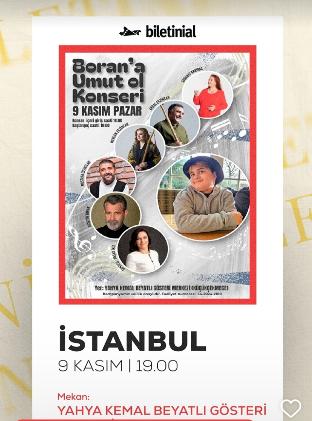 Minik Boran’ın yaşam mücadelesine umut olmak için bir araya geliyoruz. Müzik, dayanışma ve sevgiyle dolu bu özel gecede, sahneye çıkacak değerli sanatçılar kalplerimize dokunacak: Sabahat Akkiraz – Halk müziğinin güçlü sesiyle umut dolu ezgiler ,Erdal Erzincan – Bağlamasıyla yüreklere işleyen ustalık ,Hüseyin Turan,Anadolu’nun duygusunu sahneye taşıyan yorumcu ve Mercan Erzincan Genç kuşağın sesiyle duygusal bir bağ kuracak ve bu anlamlı konser, Boran’ın yolculuğuna ışık tutmak ve birlikte umut olmak için bir çağrıdır. Gelin, müziğin birleştirici gücüyle Boran’a destek olalım.
