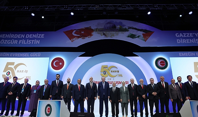 HAK-İŞ'e ilk günden beri dirayetle sürdürdüğü emek, demokrasi, özgürlük ve adalet mücadelesi için teşekkür eden Cumhurbaşkanı Erdoğan, 50. yılın HAK-İŞ camiası ile sendikalar, emekçiler, çalışma hayatı, ülke ve millet için hayırlı olmasını diledi.Türkiye'de kardeş kavgasının zirve yaptığı bir dönemde bir nevi kardeşlik ve barış ocağı olarak kurulan HAK-İŞ'te emeği geçen herkesi tebrik eden Cumhurbaşkanı Erdoğan, şöyle konuştu: "HAK-İŞ çatısı altında emekçinin davasını, hakkın, hakikatin ve adaletin davasını savunanlardan, ebedi aleme göç edenlere Rabb'imden gani gani rahmet niyaz ediyorum. HAK-İŞ'in eski genel başkanı, Çalışma Bakanımız, kıymetli yol ve dava arkadaşımız Necati Çelik'i bir kez de sizlerin huzurunda minnetle anıyorum. Hayatta olan dostlarımıza, büyüklerimize ve kardeşlerimize hayırlı, uzun, bereketli ömürler temenni ediyorum. Yine bu vesileyle özellikle iş kazalarında yitirdiğimiz işçi kardeşlerimizi rahmetle yâd ediyor, Allah onlardan da razı olsun diyorum. HAK-İŞ bünyesinde örgütlü sendikal mücadeleye katılan 81 ilimizdeki 850 bin kardeşimin her birine buradan selam ve muhabbetlerimi gönderiyorum."