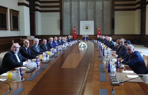 Ankara'daki Cumhurbaşkanlığı Külliyesi'nde gerçekleşen kabulde TFF 1. Başkan Vekili, İcra Kurulu Üyesi, Süper Lig'den Sorumlu Yönetim Kurulu Üyesi Mecnun Otyakmaz, TFF 2. Başkan Vekili, İcra Kurulu Üyesi, Hukuk, İdari ve Mali İşlerden Sorumlu Yönetim Kurulu Üyesi Fuat Göktaş, TFF Başkan Vekili, İcra Kurulu Üyesi, Sponsorluklar ve Pazarlamadan Sorumlu Yönetim Kurulu Üyesi Lale Cander, TFF Başkan Vekili, İcra Kurulu Üyesi, Dış İlişkiler ve Sağlık İşlerinden Sorumlu Yönetim Kurulu Üyesi Zehra Neşe Kavak, TFF Başkan Vekili, İcra Kurulu Üyesi, Millî Takımlar, FIFA ve UEFA İlişkilerinden Sorumlu Yönetim Kurulu Üyesi Ceyhun Kazancı, TFF Futbol Altyapı ve Gençlik Projelerinden Sorumlu Yönetim Kurulu Üyesi Cengiz Gökay, TFF 1. Lig Kulüplerinden Sorumlu Yönetim Kurulu Üyesi Zafer Bahadır Saraç, TFF Stratejik Planlama ve Gelişimden Sorumlu Yönetim Kurulu Üyesi Mevlüt Aktan, TFF Yönetim Kurulu Üyesi Bayram Akgül, TFF Ar-Ge'den Sorumlu Yönetim Kurulu Üyesi Hasan Surözü, TFF Kulüp Lisans İşleri, Tesisler ve Yatırımlardan Sorumlu Yönetim Kurulu Üyesi Mustafa Temel Bozbağ, TFF Amatör İşler ve Kadın Futbolundan Sorumlu Yönetim Kurulu Üyesi Ural Aküzüm, TFF Teknoloji ve Kurumsal İletişimden Sorumlu Yönetim Kurulu Üyesi Bilal Arslan ile TFF 2. ve 3. Lig Kulüplerinden Sorumlu Yönetim Kurulu Üyesi Murat Şahin yer aldı.