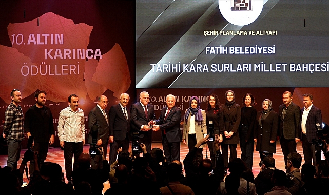 Marmara Belediyeler Birliği tarafından düzenlenen Altın Karınca Ödülleri’nde, “Karasurları Millet Bahçesi” projesi “Şehir Planlama ve Altyapı” kategorisinde ödül aldı. Fatih Belediye Başkanı M. Ergün Turan, projeyi “Donatı Odaklı Dönüşüm ve Yeşil Alan” vizyonunun önemli bir eseri olarak değerlendirerek Marmara Belediyeler Birliği’ne ve seçici kurul üyelerine teşekkür etti.Marmara Belediyeler Birliği tarafından düzenlenen Altın Karınca Ödülleri, Fatih Belediye Başkanı M. Ergün Turan’ın katılımıyla gerçekleştirildi. Törende, Fatih Belediyesi’nin “Karasurları Millet Bahçesi” projesi, “Şehir Planlama ve Altyapı” kategorisinde ödüle layık görüldü.Tarihî kara surları çevresinde niteliksiz yapıların temizlenmesi, bölgenin yeşil alan oranının artırılması ve alanın daha güvenli, yaşanabilir bir hale getirilmesini amaçlayan proje, çevre düzenlemesi ve planlama alanında örnek bir çalışma olarak öne çıkıyor. Başkan Turan, ödül töreninde yaptığı konuşmada “Karasurları Millet Bahçesi” projesinin “Donatı Odaklı Dönüşüm ve Yeşil Alan” vizyonunun en değerli eserlerinden biri olduğunu ifade ederek bu anlamlı ödül için Marmara Belediyeler Birliği’ne ve seçici kurul üyelerine teşekkürlerini iletti. Ayrıca projede emeği geçen tüm ekip arkadaşlarının özverili çalışmalarının bu başarıda önemli bir payı olduğunu vurguladı.Başkan Turan, proje ile sadece fiziksel bir dönüşüm değil, aynı zamanda bölgenin tarihî dokusuna uygun bir yenilenme sürecinin de hayata geçirildiğini belirterek Fatih Belediyesi’nin şehir planlama ve çevre alanındaki çalışmalarının süreceğini ifade etti.