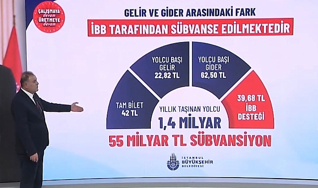 - Aradaki 39.68 TL’lik farkın İBB bütçesinden karşılandığını, yalnızca İETT için yıllık 55 milyar TL destek sağlandığını söyledi.