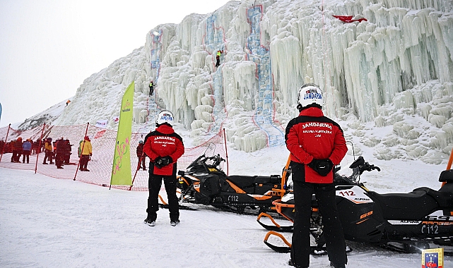 Erzurum İl Jandarma Komutanlığı emrinde görevli Jandarma Arama Kurtarma (JAK) Timleri, Palandöken Kayak Merkezi'nde düzenlenen Ice Park Türkiye Şampiyonası'nda güvenliği sağlamak amacıyla görev aldı.