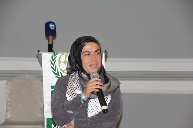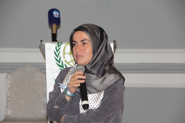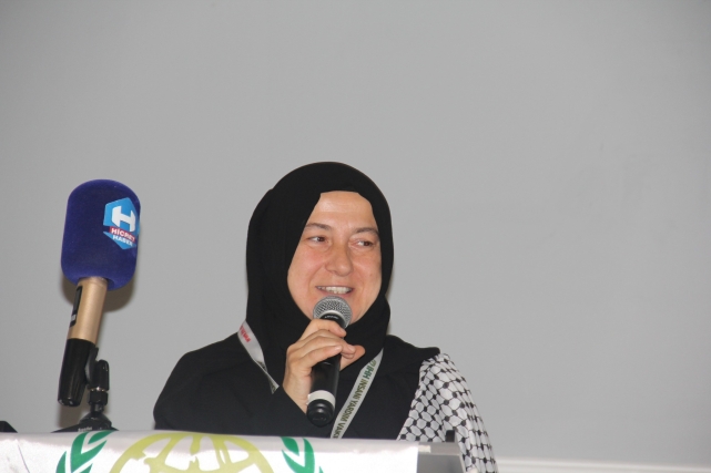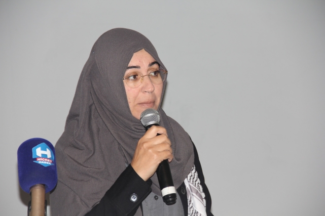 Programın onur konuğu Beytül Makdis Öncüleri Derneği Hanım Birimi Başkanı Dilek Tekkoca, “Gazze Bize Ne Diyor?” başlıklı konuşmasıyla salonu derin bir sessizliğe bürüdü. Dilek Tekocak, yıllardır Filistin üzerine saha çalışmaları yapan, “Sumut Filosu” adı verilen sivil dayanışma hareketinin öncülerinden biri olarak, direnişin kalbinden tanıklıklarını paylaştı. Konuşmasına şu sözlerle başladı:“Bakın, daha en baştan yanlış söylüyoruz. Gazze 2 yıldır değil, 77 yıldır işgal altında. 17 yıldır da abluka altında. Dışarıdan kalemin, mürekkebin, biberonun, hatta gelinliğin bile içeriye girişi yasak. Düşünün, bir şehrin nefesi kesilmiş ama halkı hâlâ direniyor.”