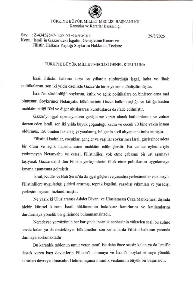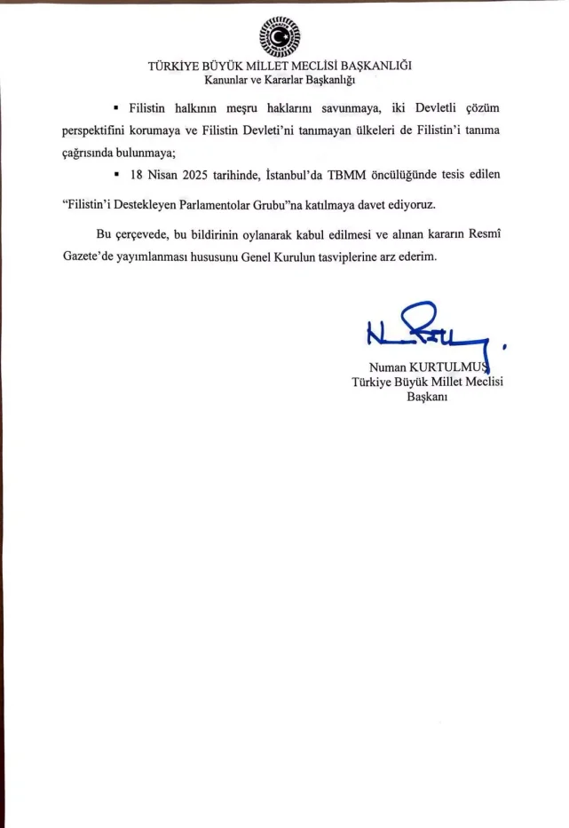 Tezkere, TBMM Başkanı Numan Kurtulmuş’un imzasıyla Meclis gündemine taşındı. Kurtulmuş, Filistin meselesinde Türkiye’nin tarihi ve vicdani sorumluluğunu vurguladı.