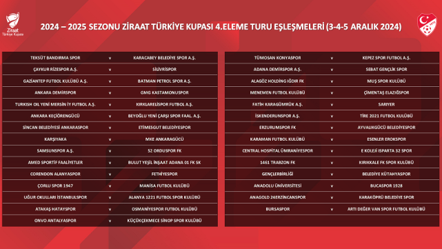 Ziraat Türkiye Kupası 4. Eleme Turu'nda, 3. Eleme Turu müsabakaları sonucu tur atlayan 35 takımın yanı sıra Trendyol Süper Lig'den 5, Trendyol 1. Lig'den 9 ve Nesine 2. Lig'den 9 olmak üzere toplam 58 takım mücadele edecek. Müsabakalar tek maç eleme usulüne ve seri başı sistemine göre 3, 4 ve 5 Aralık tarihlerinde oynanacak, müsabaka programı ise daha sonra ilan edilecek. Müsabakalar, kurada küçük numarayı çeken takımların sahasında oynanacak ve galip gelen 29 takım tur atlayacak.