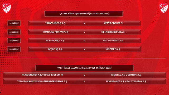 Neşe Kavak'ın açılış konuşması ve TFF Lig Yönetimi Direktörü Besim Yalçın'ın teknik bilgilendirmesinin ardından gerçekleştirilen kura çekimiyle Ziraat Türkiye Kupası'nda çeyrek final ve yarı final eşleşmeleri belli oldu.